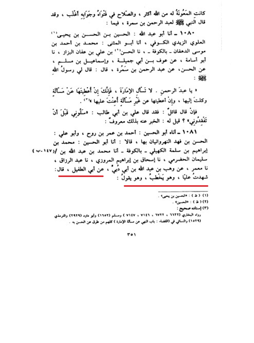 Van Abi Tufayl, die zei: Ik was getuige toen Ali aan het prediken was en zei: “Vraag mij, want ik zweer bij Allah dat er niets is dat zal plaatsvinden tot aan de Dag der Opstanding waar jullie mij over kunnen vragen, behalve dat ik jullie kan beantwoorden. En vraag mij over het boek van Allah, want ik zweer dat er geen enkel vers is waarvan ik niet weet of het geopenbaard is in de avond of overdag, of op een lage vlakte of op een gebergte.”